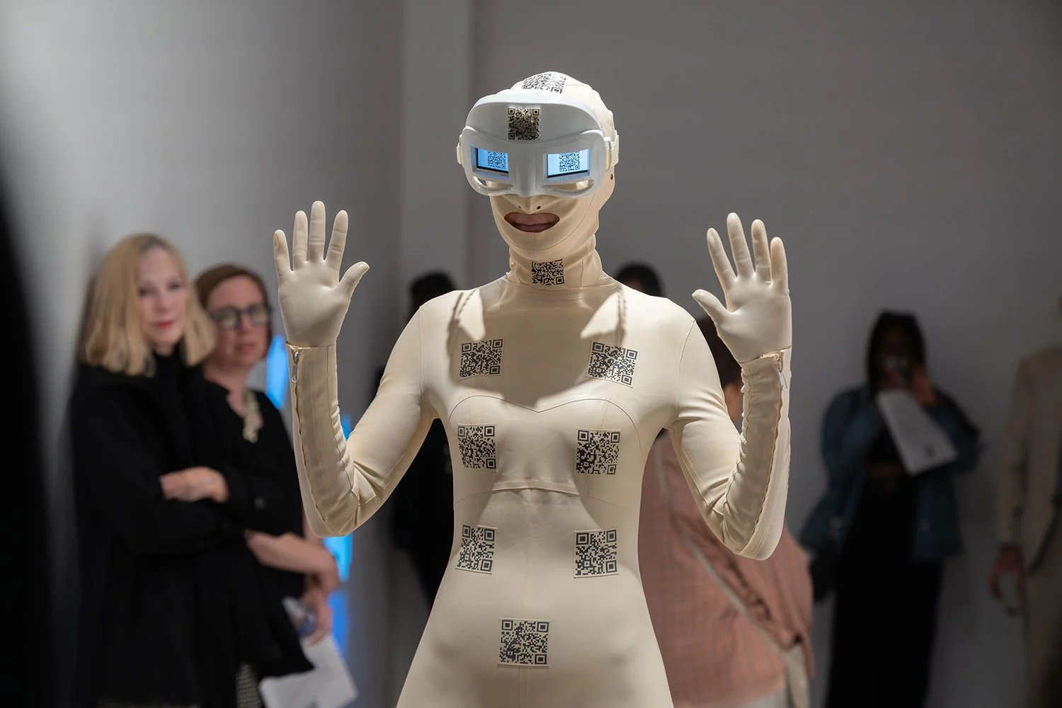 Body Code is an art project where the artist’s latex suit contains printed QR codes that the public can scan with their smartphones. The QR codes on the suit redirect the viewer to the website where they can see data found on the web about the body.